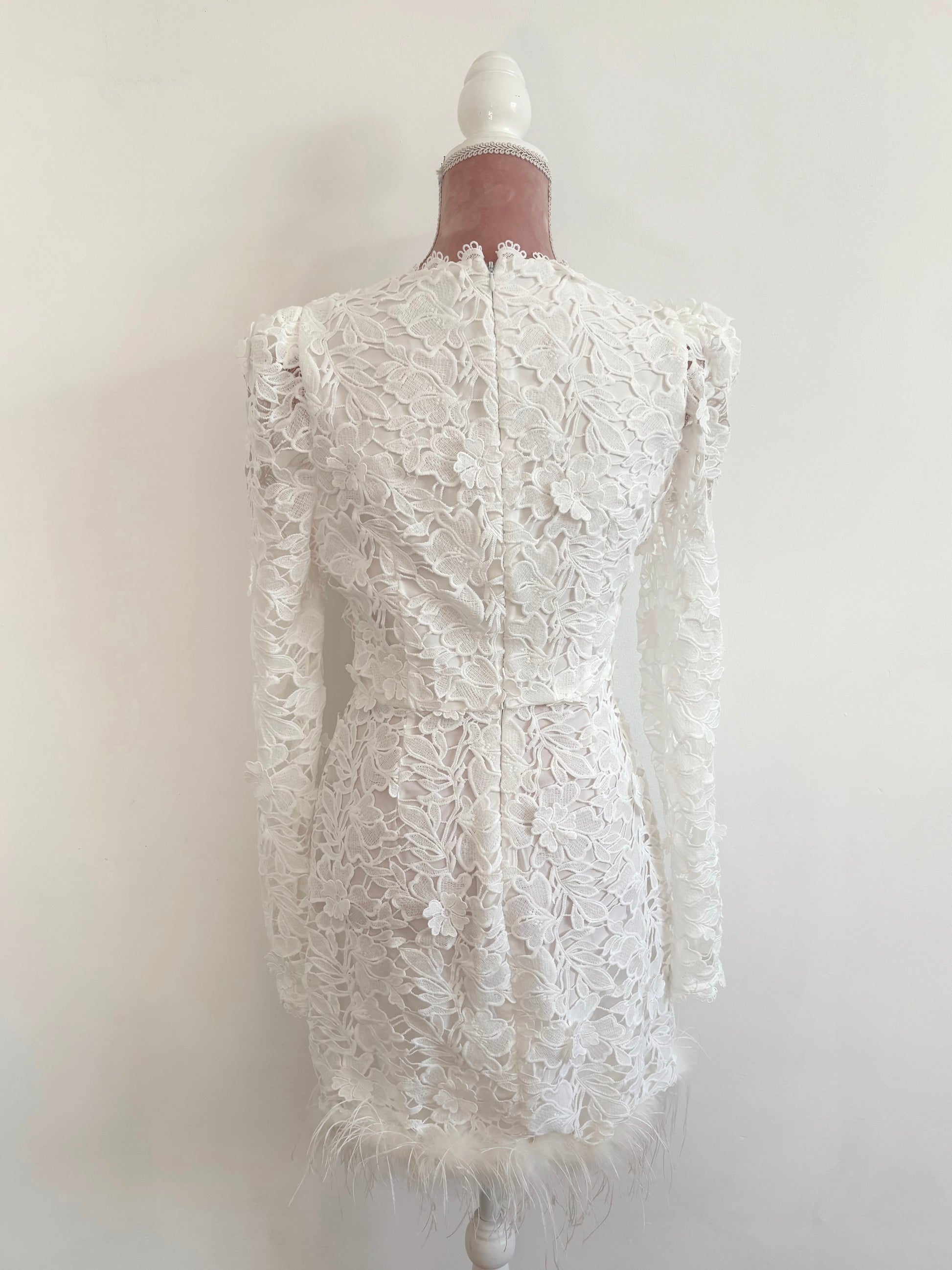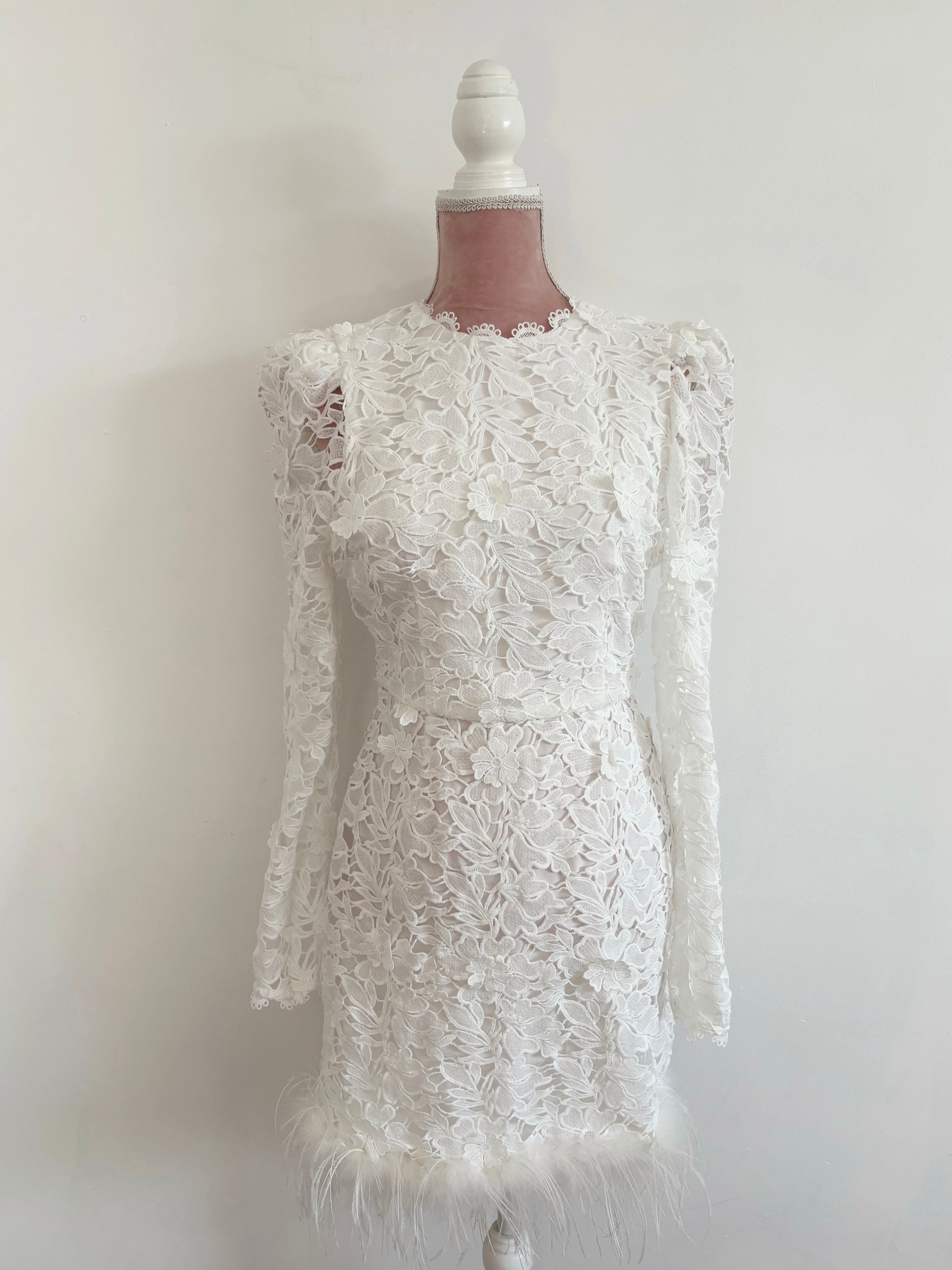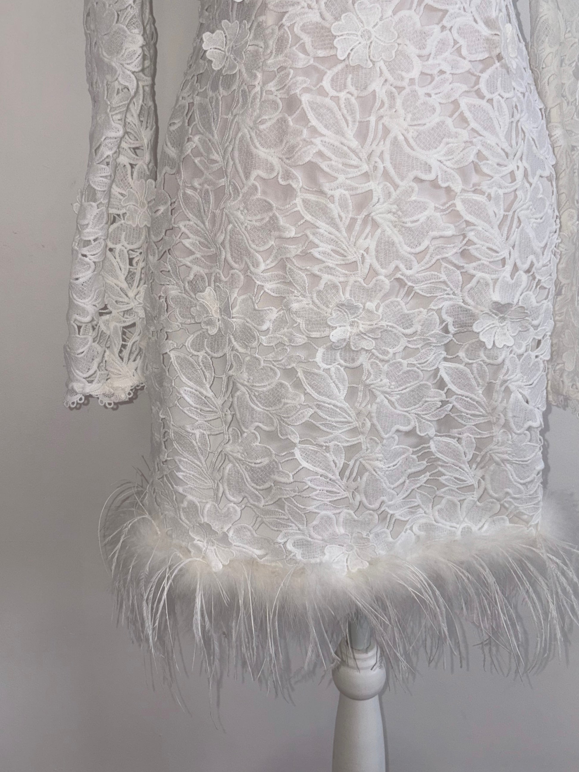 Brighton is playful, bold, and effortlessly chic. This crochet lace mini dress features long sleeves and a high neckline, perfectly balancing vintage charm with modern attitude. The feather trim adds a fun, flirtatious twist, making Brighton ideal for the bride who wants to dance all night and make a fashion-forward statement.