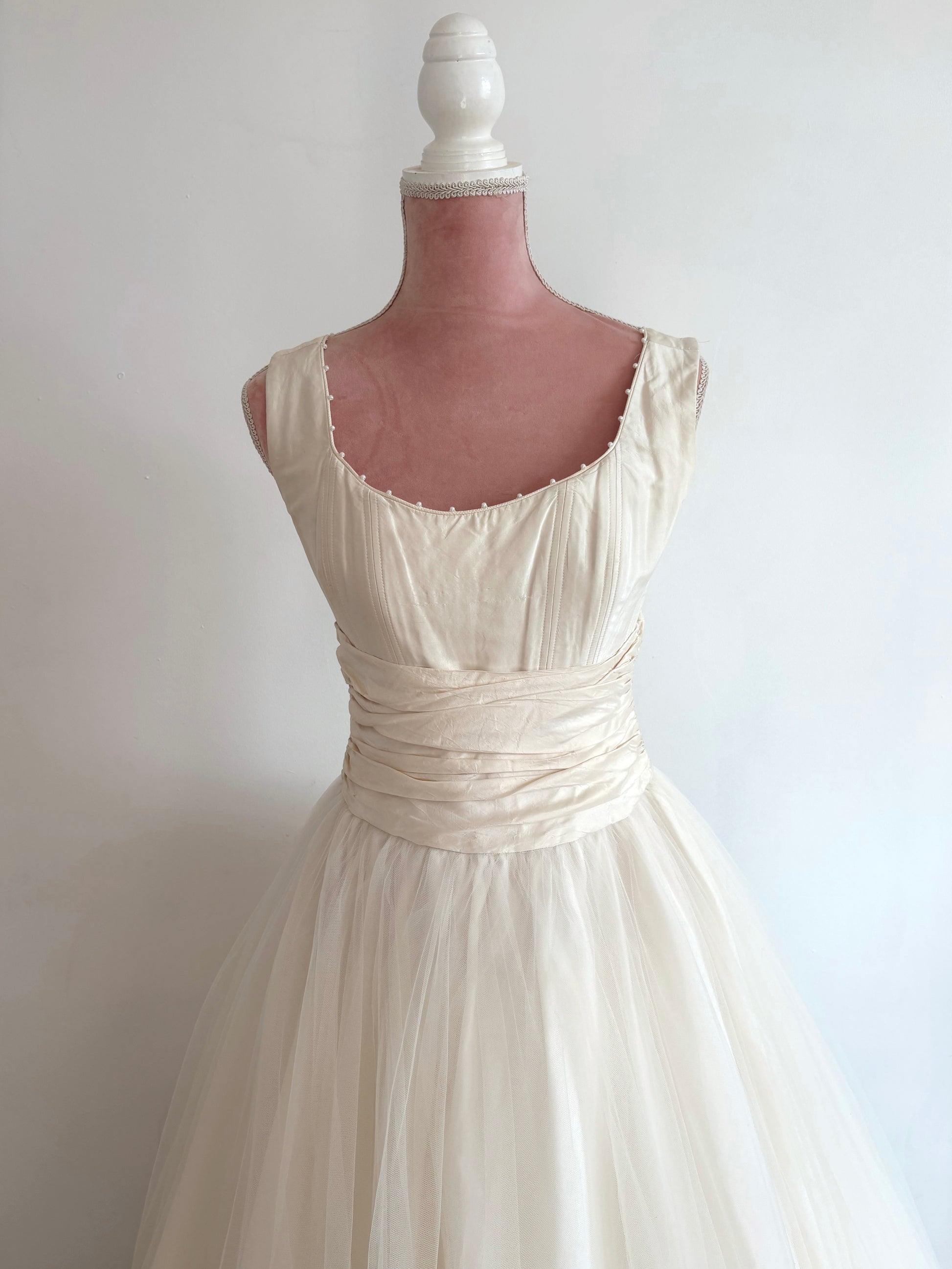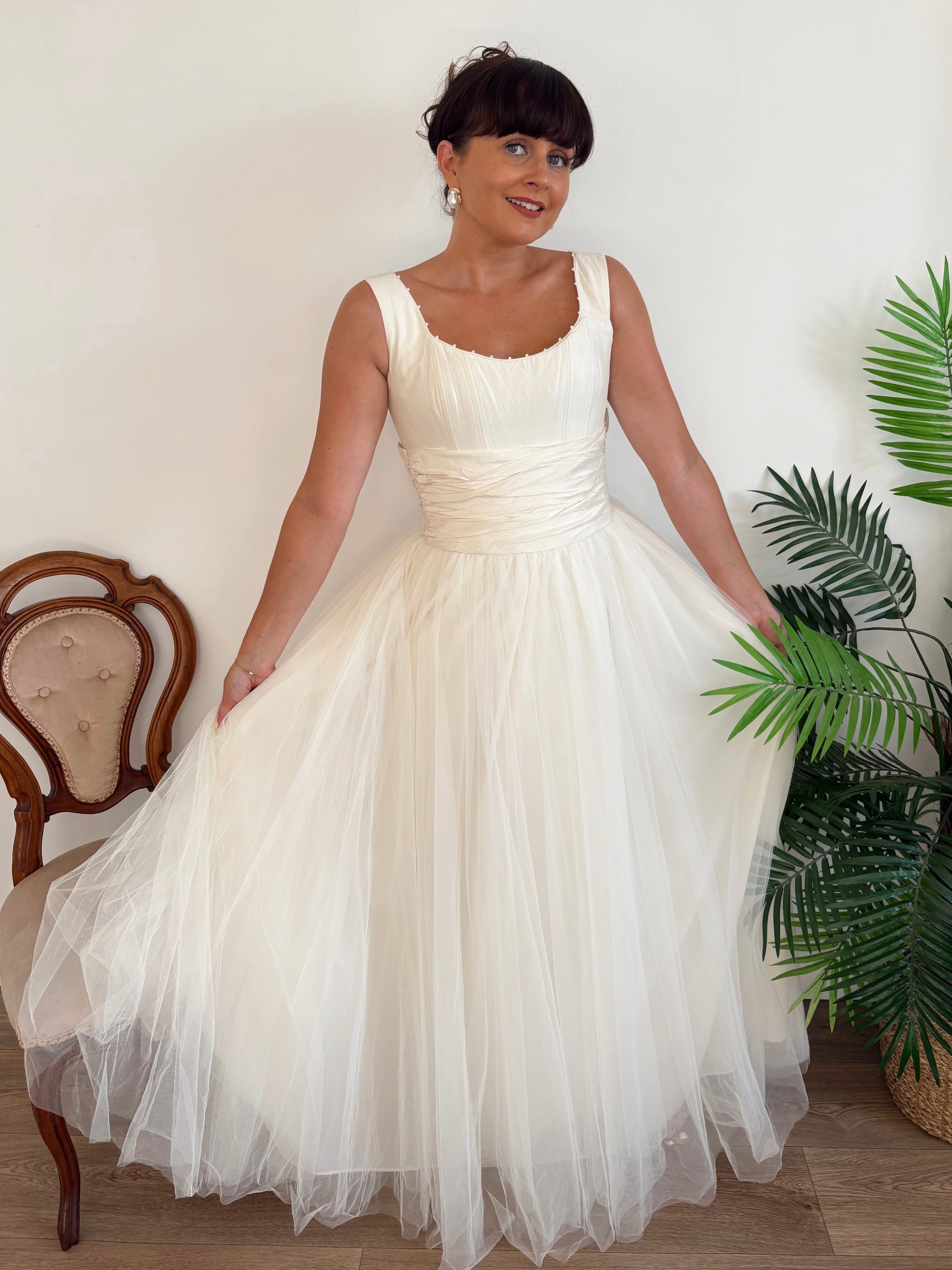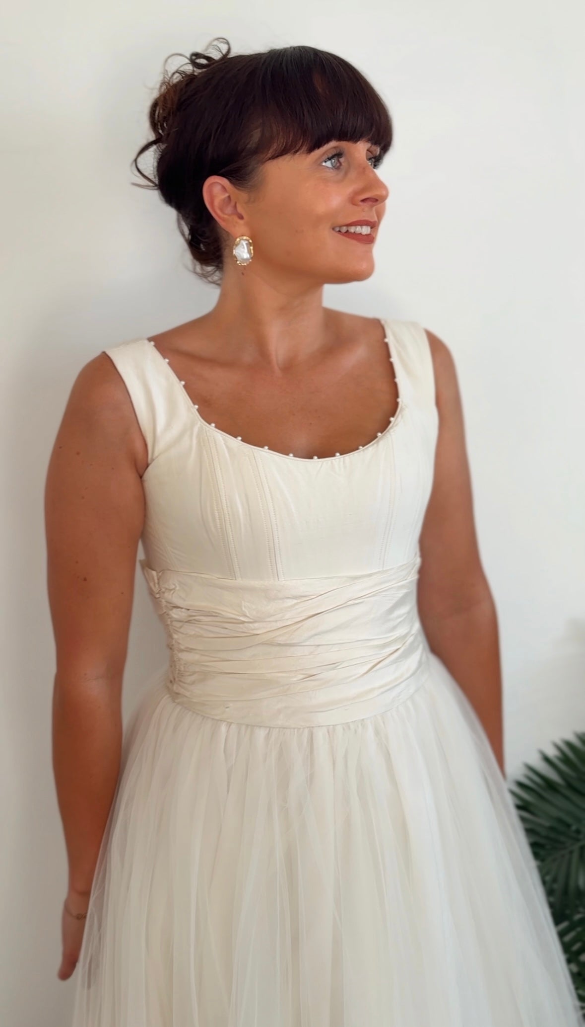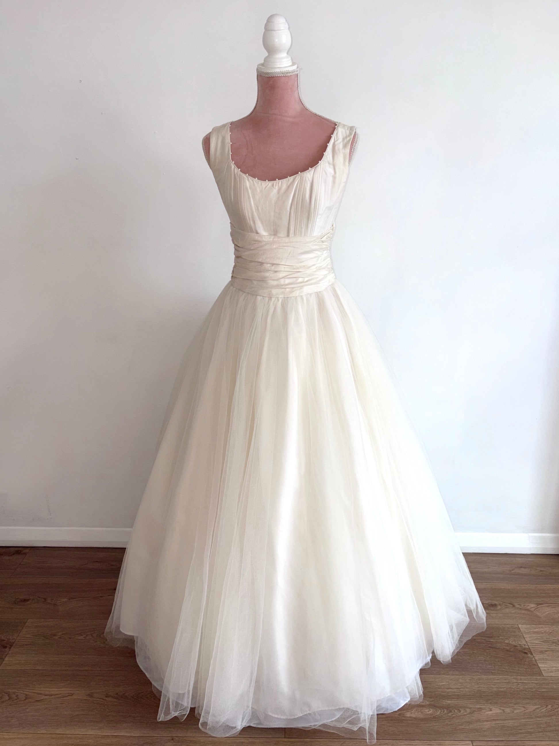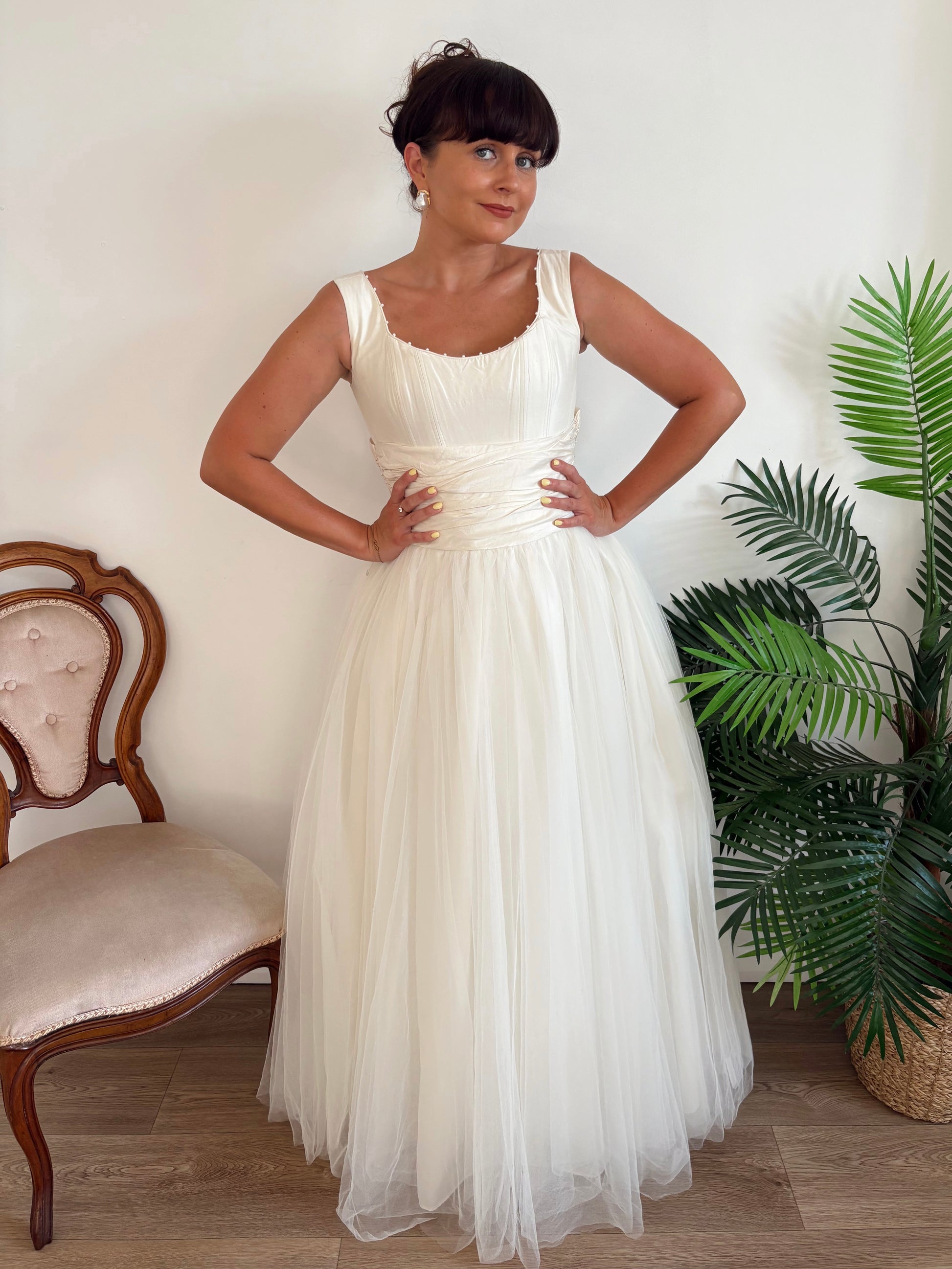 Romantic and ethereal, this vintage gown evokes all the grace of a ballerina. The delicately ruched, silk bodice features a modest neckline traced with tiny pearls, offering a soft, luminous detail that feels both refined and enchanting. A wide, ruched drop waistline sculpts the silhouette beautifully, leading into a sweeping A-line skirt crafted from six layers of tulle, satin, and chiffon. This gown captures timeless femininity and a sense of light, effortless movement, perfect for brides seeking a dreamlike, ballerina-inspired silhouette.