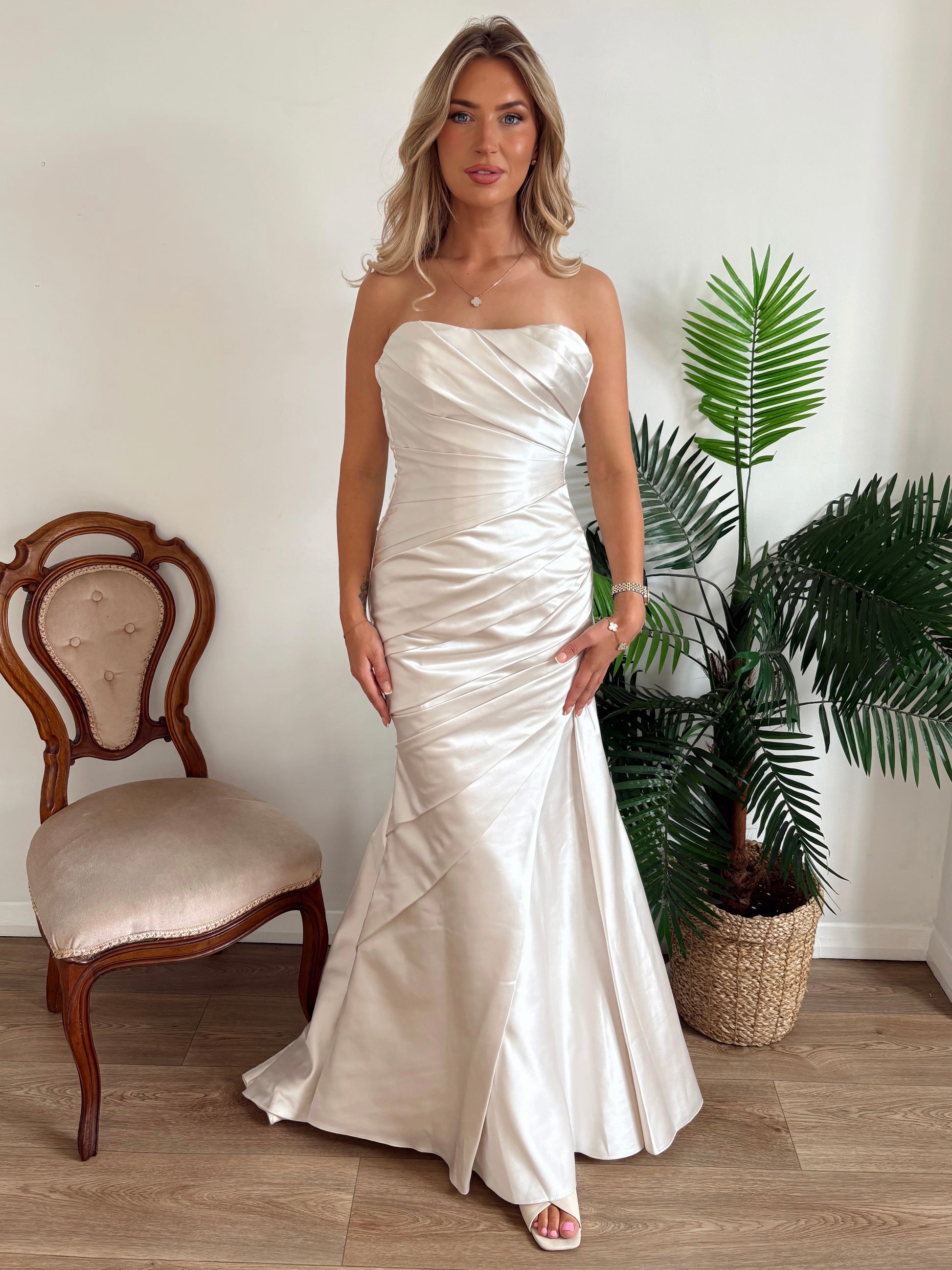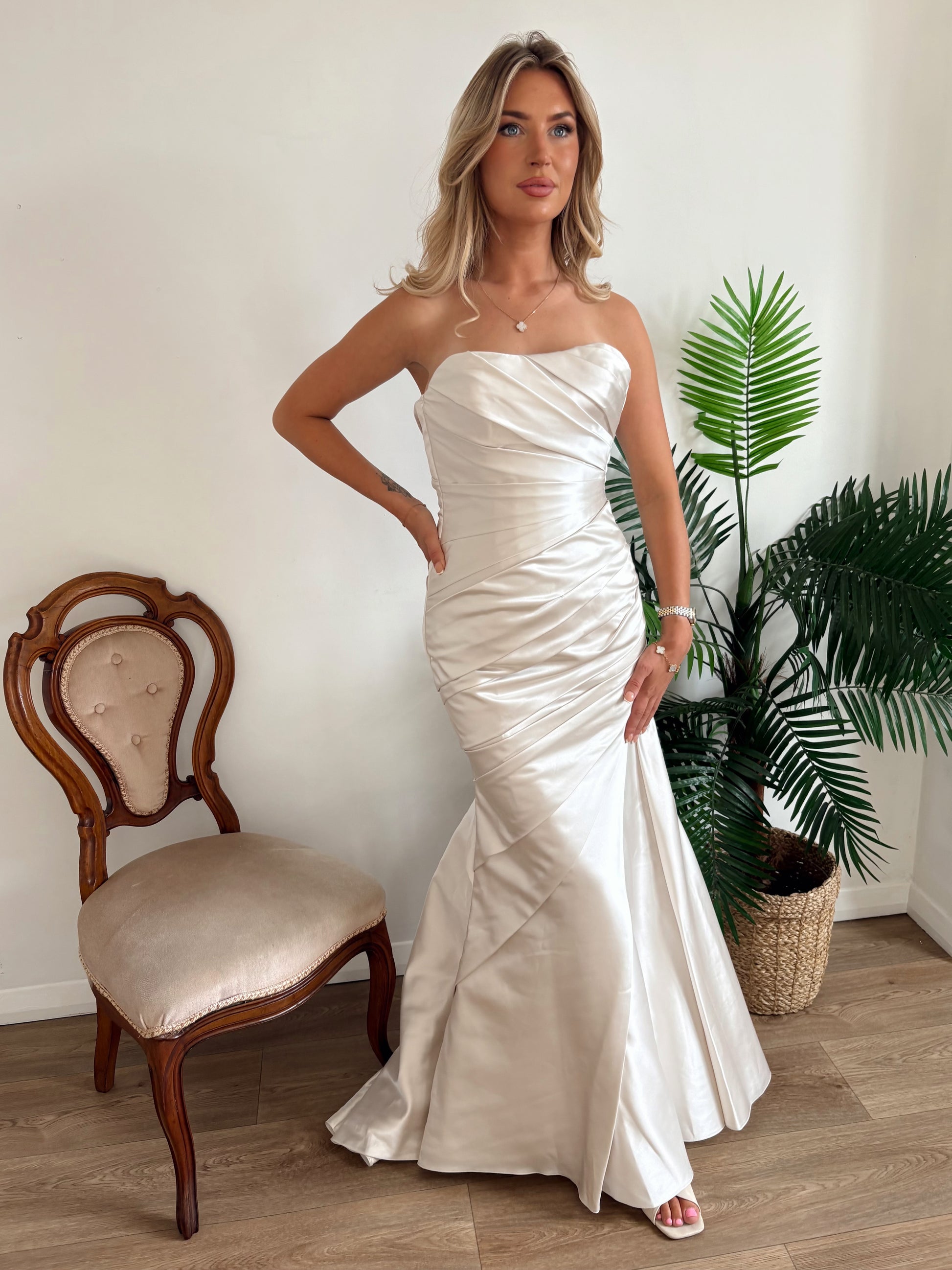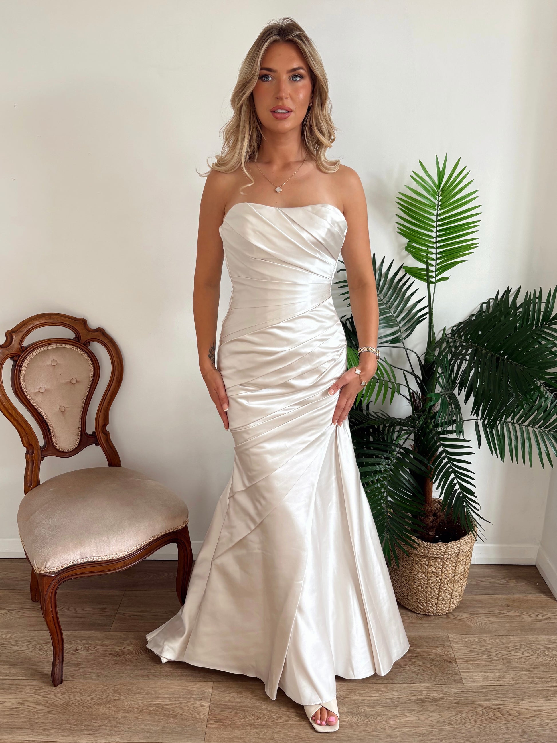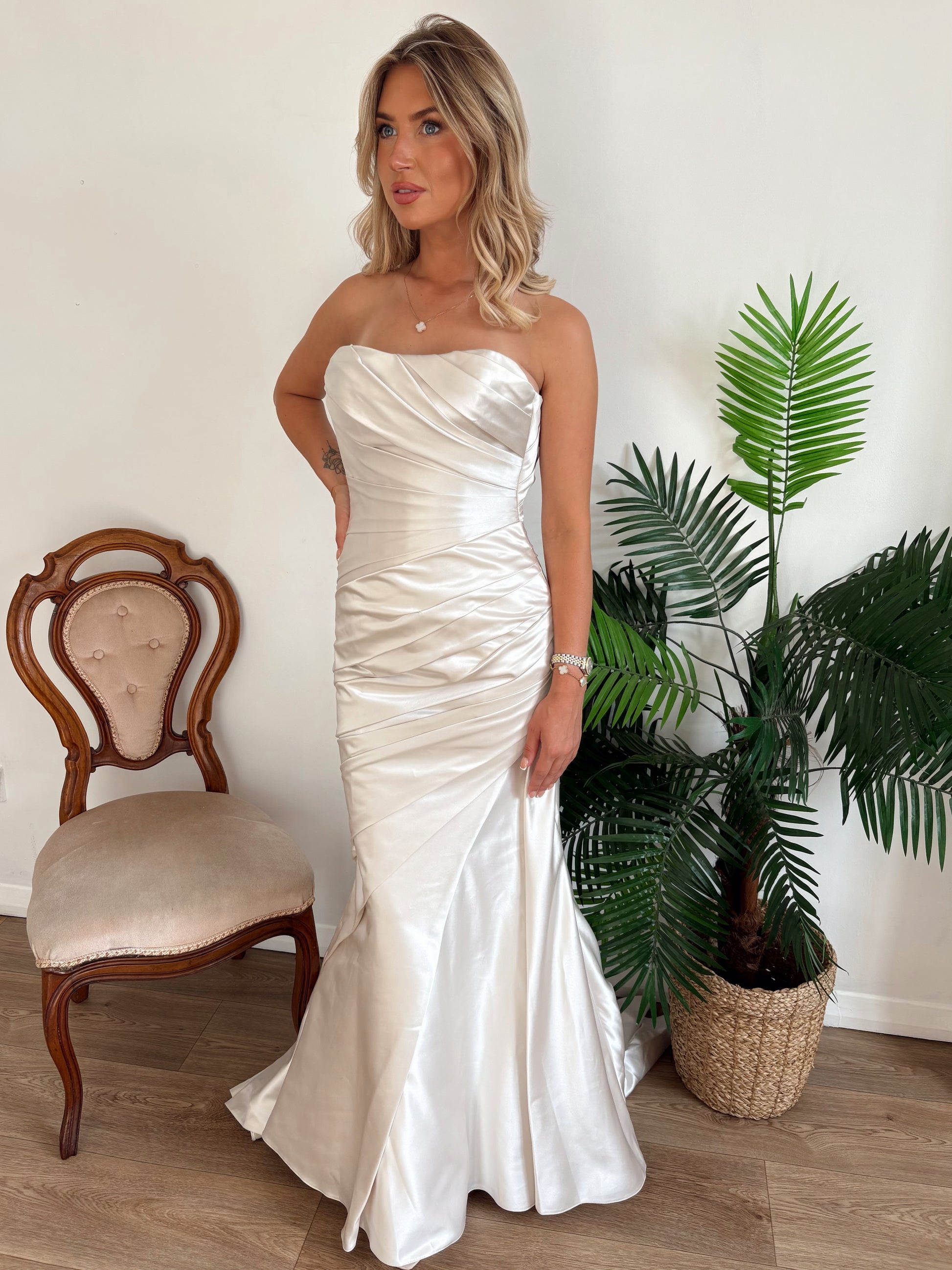 Elevate your bridal moment with Brontë, a luminous champagne-hued fishtail gown that exudes refined drama. The strapless design features a gently curved sweetheart neckline, while the ruched bodice sculpts your figure. Crafted from satin fabric with a luxurious shine, Brontë catches the light in all the right ways, transitioning effortlessly into a sultry fishtail skirt that flares gracefully into a sweeping train, perfect for a grand entrance.